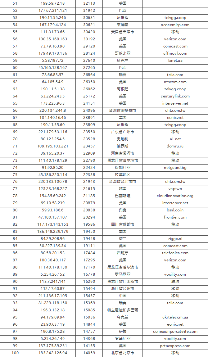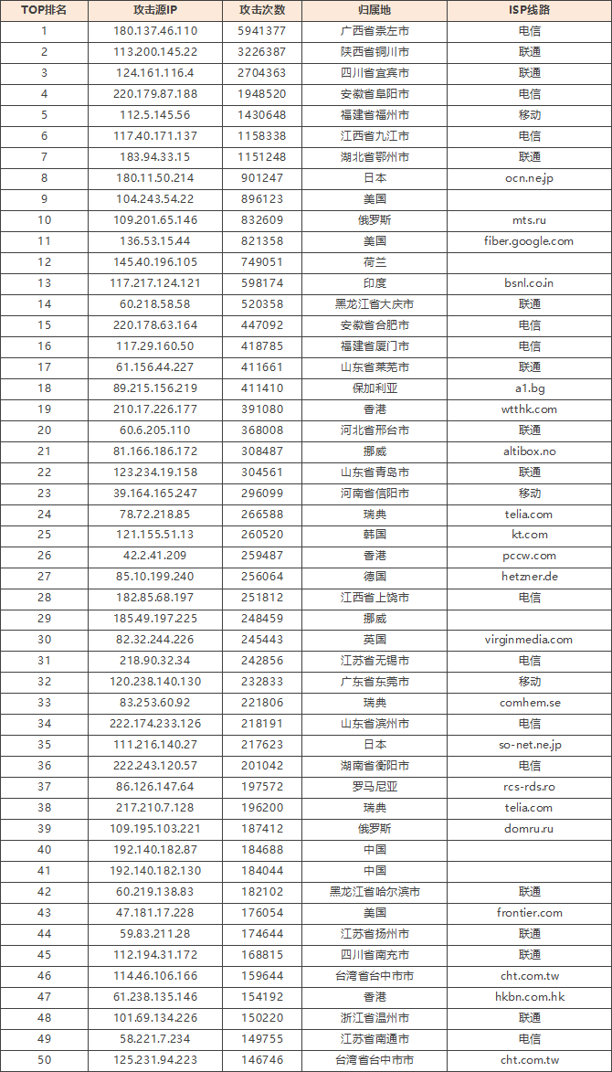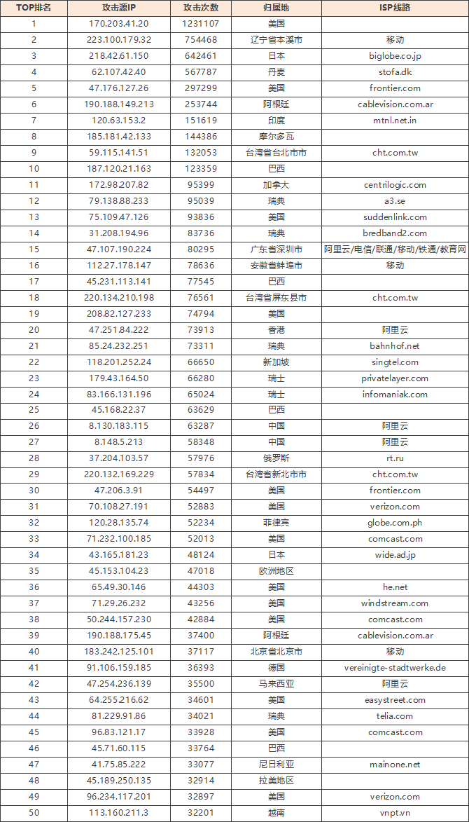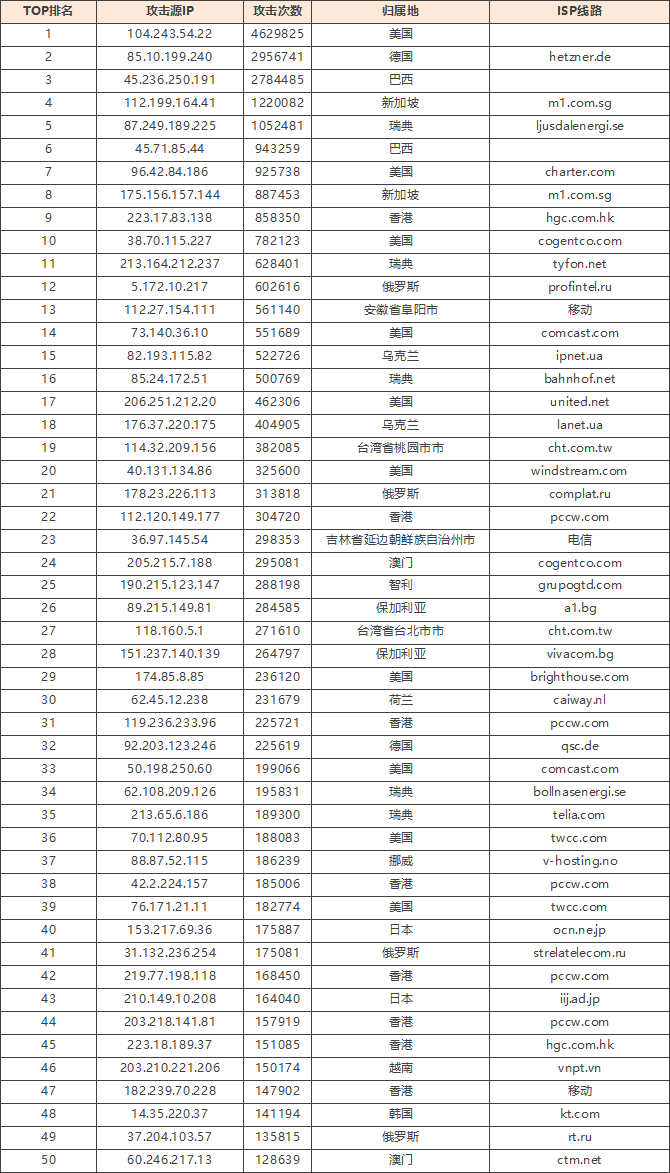 免责声明:因 IP 地理位置数据库存在更新延迟,报告中显示的属地和运营商信息仅供参考。鉴于 DDoS 攻击流量中可能存在虚假源 IP, 如您将下列攻击源信息应用于网络安全设备策略,由此产生的误判或误拦后果,傲盾软件概不承担相关责任。