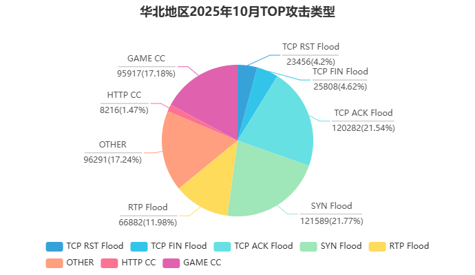 • 华北地区:攻击总次数 1,166,627 次,平均单次持续时长约 120 秒。其中多起攻击峰值接近 1Tbps,部分发生于9月末延续至10月初。攻击类型以大规模SYN/UDP洪泛为主, 辅以随机端口探测与低频应用层连接尝试。