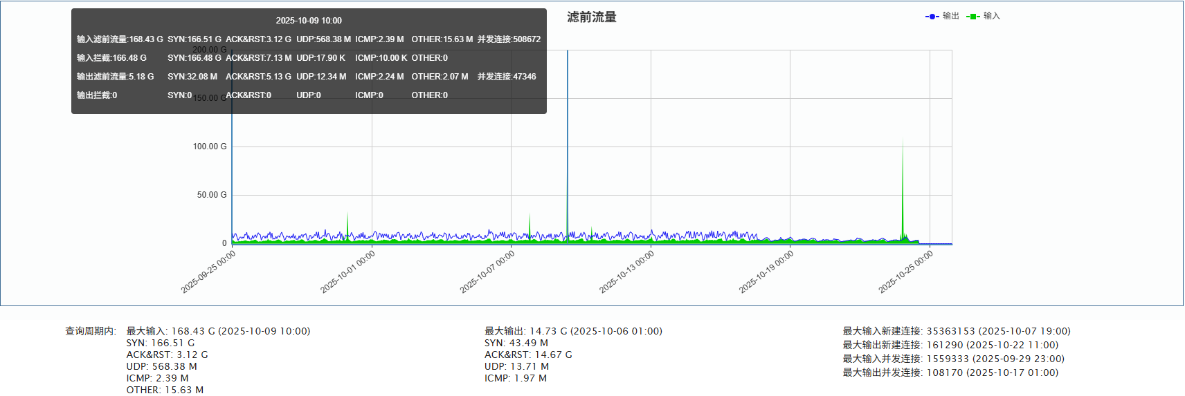►单次最大攻击流量 168.43Gbps (发生于 2025-10-09 09:50至10:00时段)
