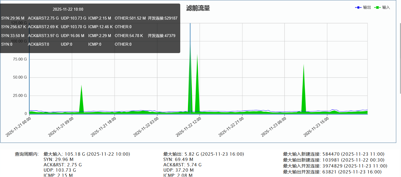 ►单次最大攻击流量105.18 Gbps(发生于 2025-11-22 09:90至10:00时段)
