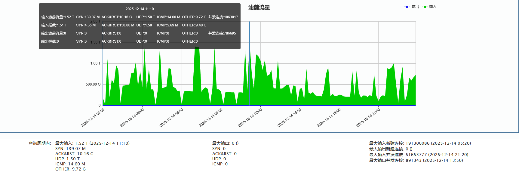 ►单次最大攻击流量 1.52 Tbps(发生于 2025-12-14 11:10至11:20时段)