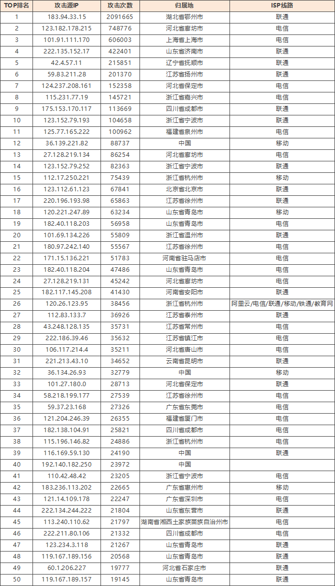 免责声明:因 IP 地理位置数据库存在更新延迟,报告中显示的属地和运营商信息仅供参考。鉴于 DDoS 攻击流量中可能存在虚假源 IP, 如您将下列攻击源信息应用于网络安全设备策略,由此产生的误判或误拦后果,傲盾软件概不承担相关责任。