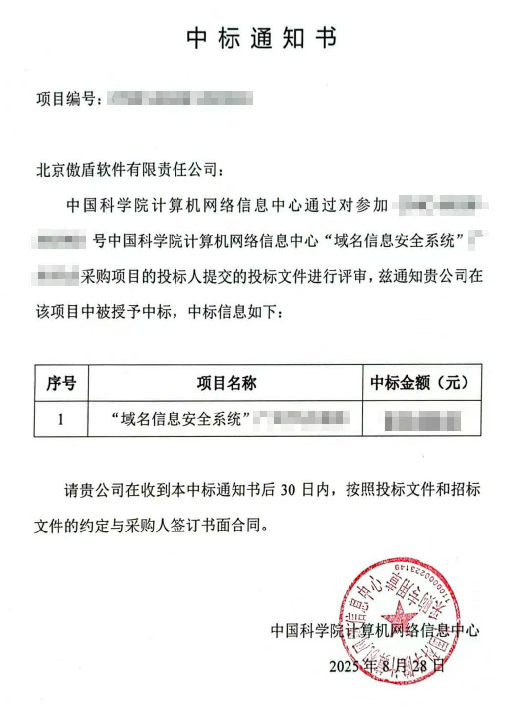 近日,傲盾公司顺利中标中国科学院计算机网络中心“域名信息安全系统”采购项目。这是团队长期专注技术创新与客户价值交付的结果, 也是客户对我们产品与服务的又一次信任选择。