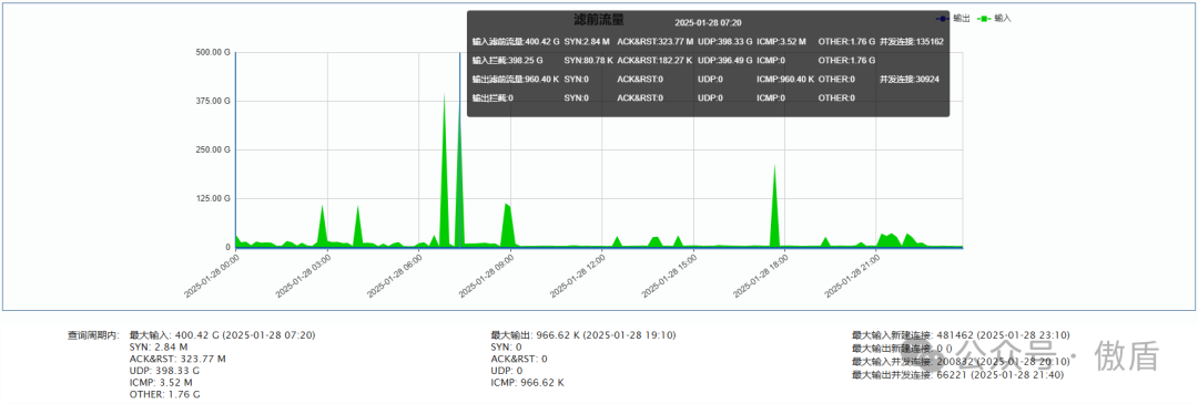 ►联通方向:单次最大攻击流量 400.42G 于2025-01-28 07:20
