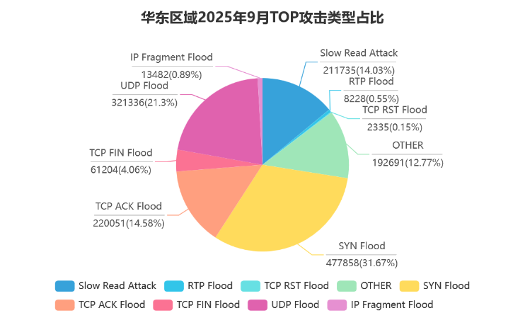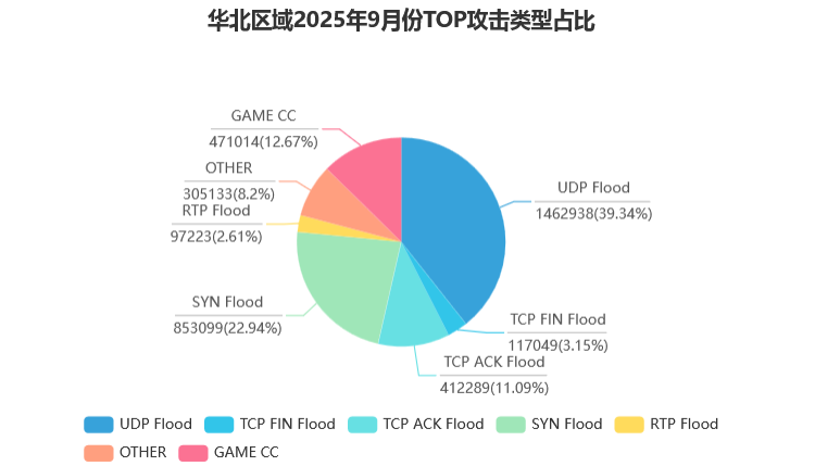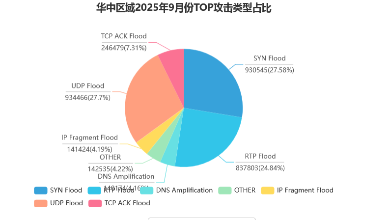 攻击类型上,各区域主流类型不同。华北区域 RTP Flood 占比最高(39.34%),其次是 SYN Flood(22.94%);华中区域 UDP Flood(27.7%)与SYN Flood(27.58%) 占比接近,是主要攻击类型;香港区域以 UDP Flood 为主(43.48%);北美区域攻击类型数据虽部分模糊,但仍能看出 UDP 相关攻击占比不低。此外, 各区域单次 100G 以上攻击次数较多,华北 342 次、华中 13203 次、华东8188 次、香港 68 次、北美 203 次,反映出大流量攻击常态化。