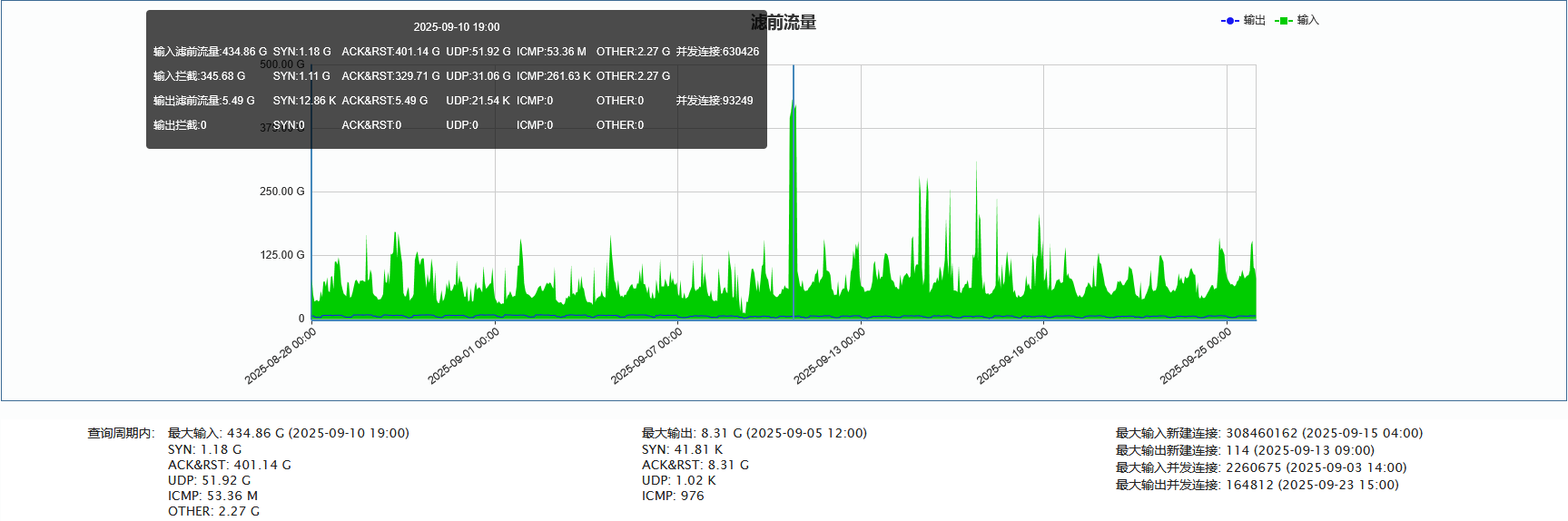 ( 清洗系统以 10 分钟为一个统计周期,对输入流量进行监测和记录。在每个周期内,系统会分别提取过滤前总流量以及 SYN、ACK&RST、UDP、ICMP、OTHER 等各类流量的峰值作为该周期的统计结果。由于不同类型流量的峰值出现时间点往往并不一致,因此在结果展示中,“输入滤前总流量” 通常小于各类流量峰值的简单加和。 后续不再重复说明。)