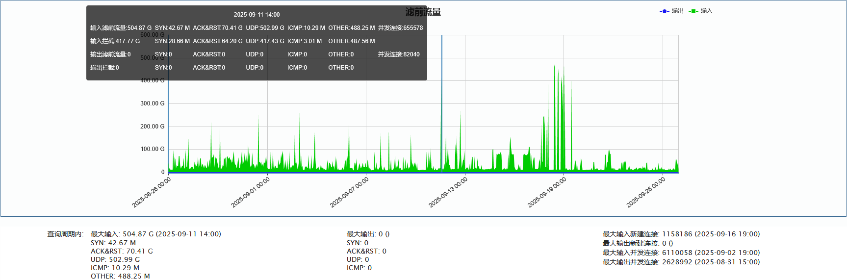 ►移动方向:单次最大攻击流量为504.87 Gbps(发生于2025-09-11 14:00至14:10时段)
