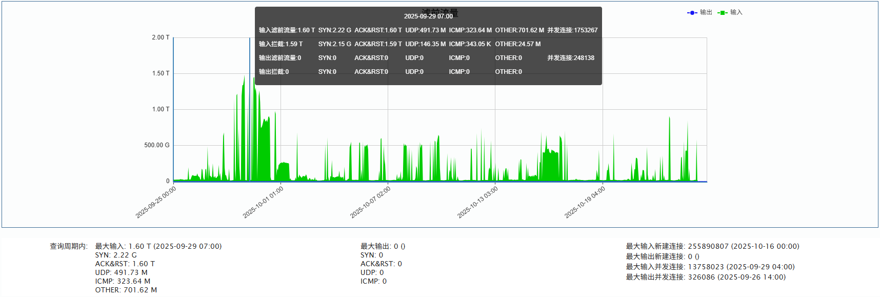 2025年10月,网络安全防护进入新一轮严峻考验,与年中相比,近期攻击行为在频率与复杂度上均显著提升,除传统的大流量洪泛攻击外, 更出现了“多向并发”与“分布式探测”并行的新型攻击模式。攻击者通过高并发端口扫描、漏洞探测与流量混淆技术,对目标网络进行持续性资源摸排,形成更具针对性与隐蔽性的攻击链。 这类攻击方式使得流量特征更加离散、检测难度显著提高,对防御体系的实时响应能力提出了更高要求。