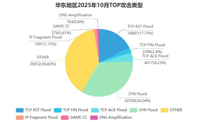 • 华北地区:攻击总次数 1,166,627 次,平均单次持续时长约 120 秒。其中多起攻击峰值接近 1Tbps,部分发生于9月末延续至10月初。攻击类型以大规模SYN/UDP洪泛为主, 辅以随机端口探测与低频应用层连接尝试。