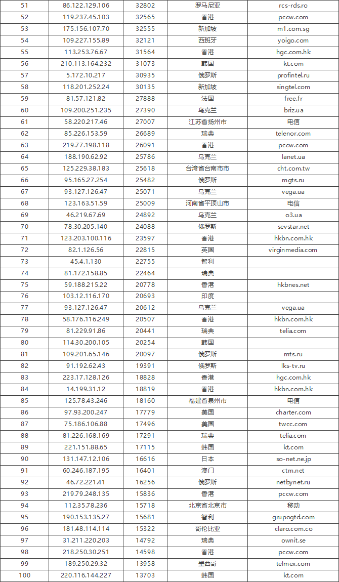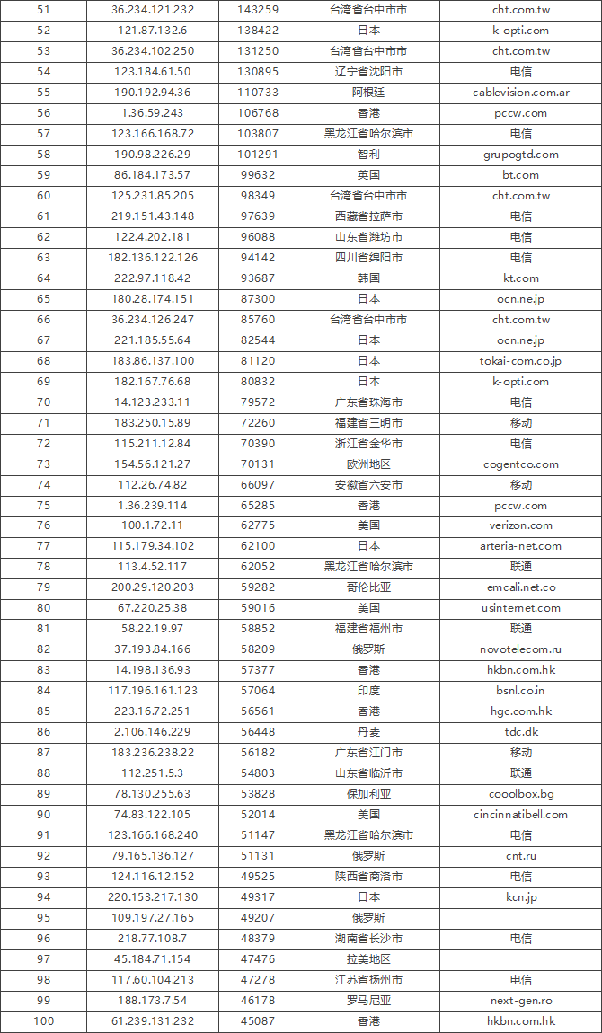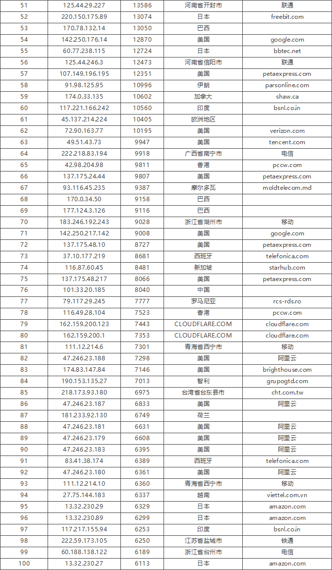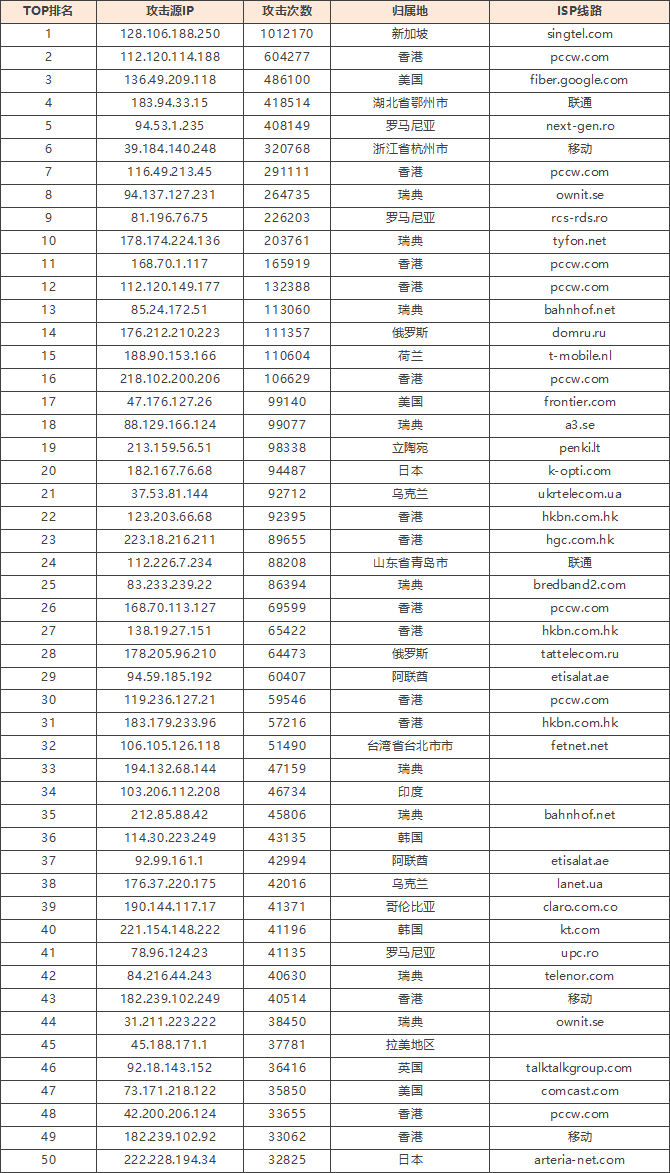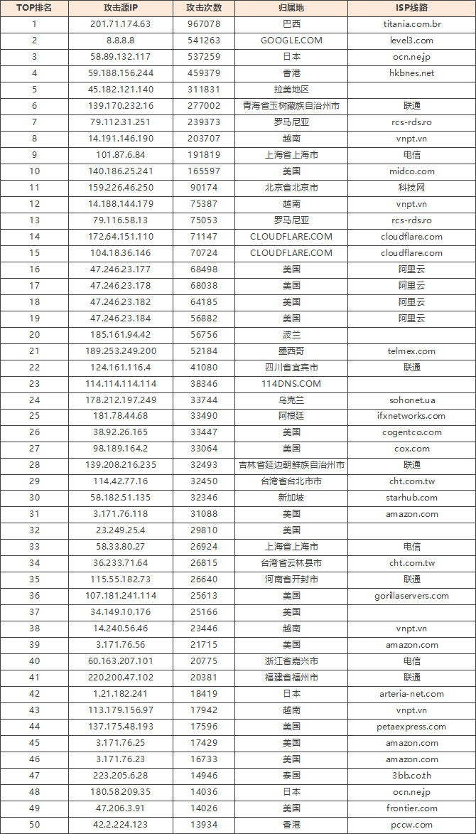 免责声明:因 IP 地理位置数据库存在更新延迟,报告中显示的属地和运营商信息仅供参考。鉴于 DDoS 攻击流量中可能存在虚假源 IP, 如您将下列攻击源信息应用于网络安全设备策略,由此产生的误判或误拦后果,傲盾软件概不承担相关责任。