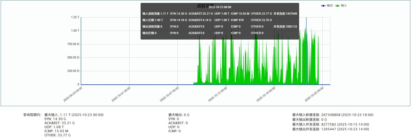 ►单次最大攻击流量 1.11 T bps(发生于 2025-10-22 23:50至24:00时段)
