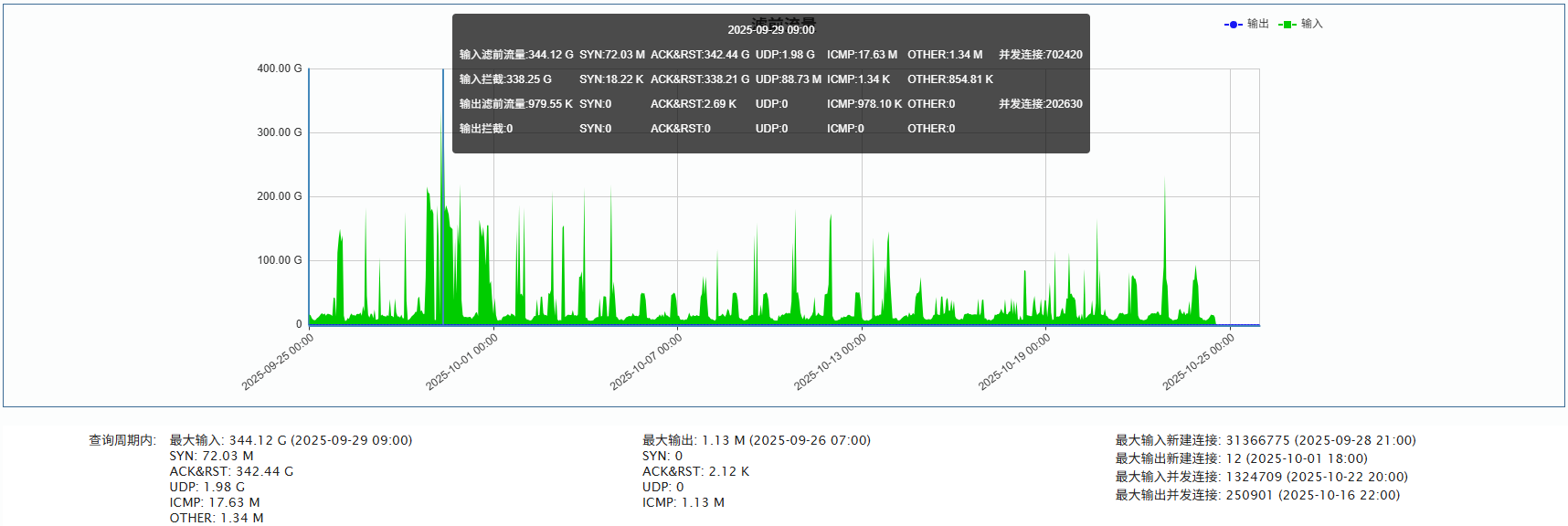 ►联通方向:单次最大攻击流量 344.12Gbps(发生于2025-09-29 08:50至09:00时段)