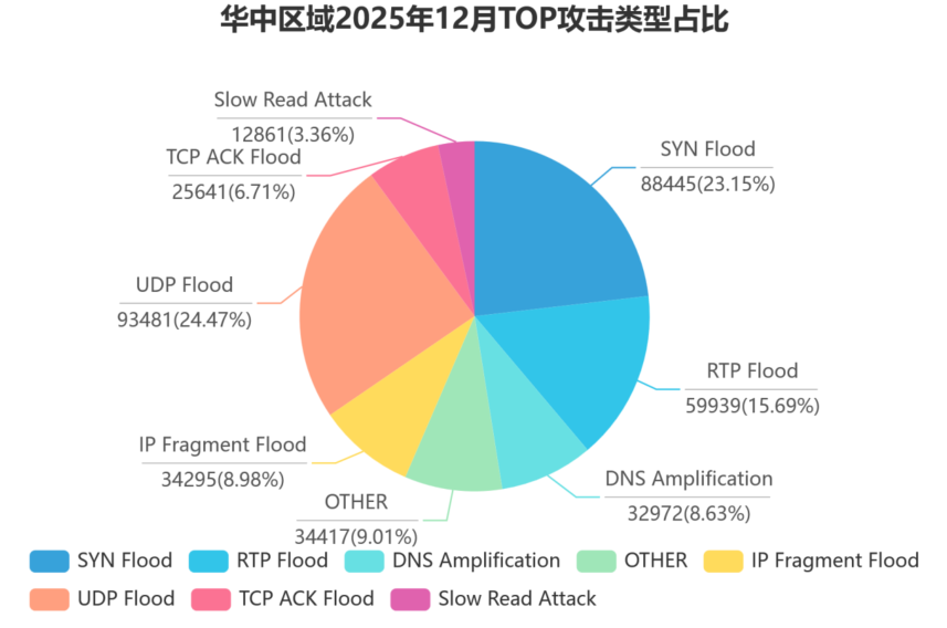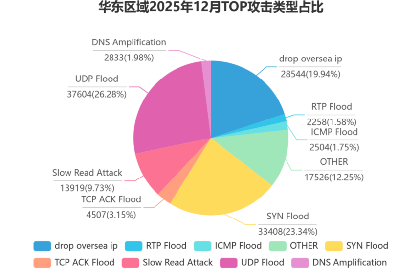 华东区域——攻击总次数达 208,572 次,单次最大攻击流量突破 1.01Tbps,创下区域攻击流量峰值新高。攻击强度不容小觑。 从攻击类型来看,UDP Flood 以 26.28% 的占比位居首位,SYN Flood 紧随其后,占比 23.34%,两者合计占据近半数攻击场景, 呈现出传统攻击与针对性攻击并存的特点。
