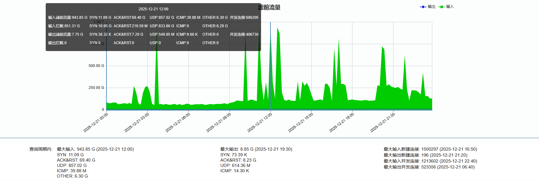 ►电信方向:单次最大攻击流量为943.85 Gbps(发生于2025-12-21 12:00至12:10时段)