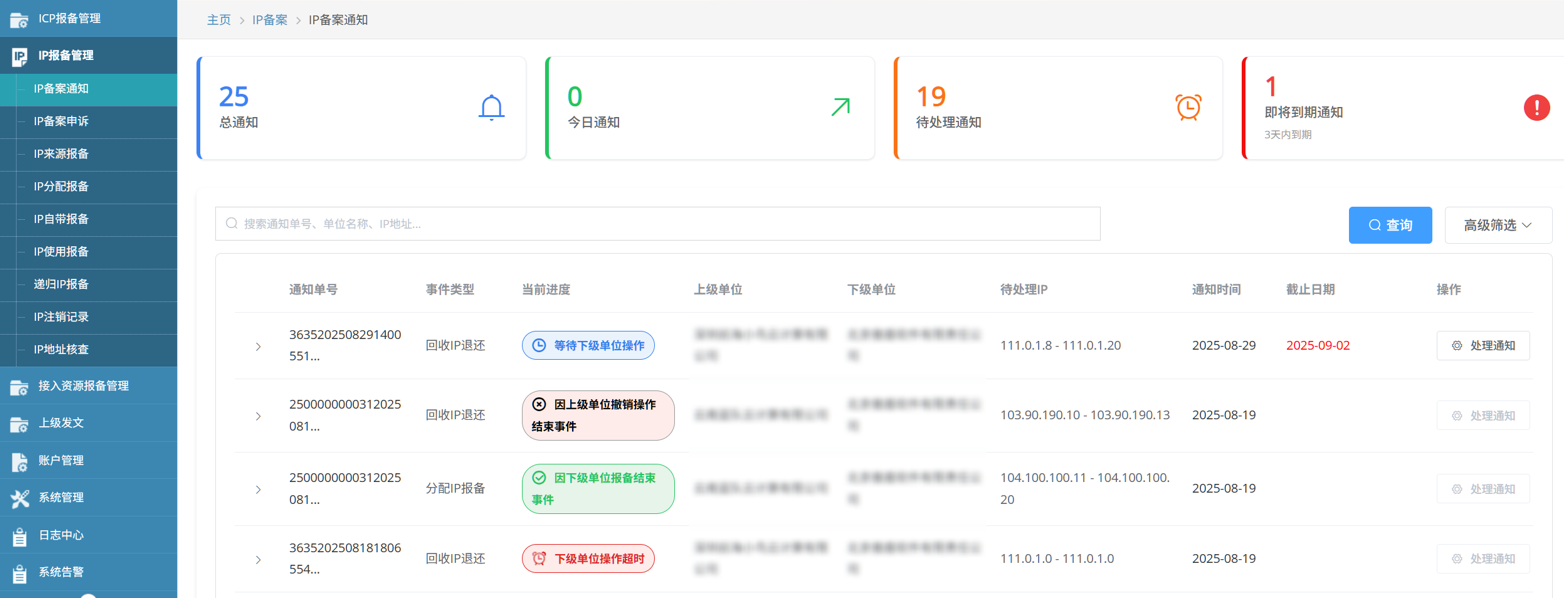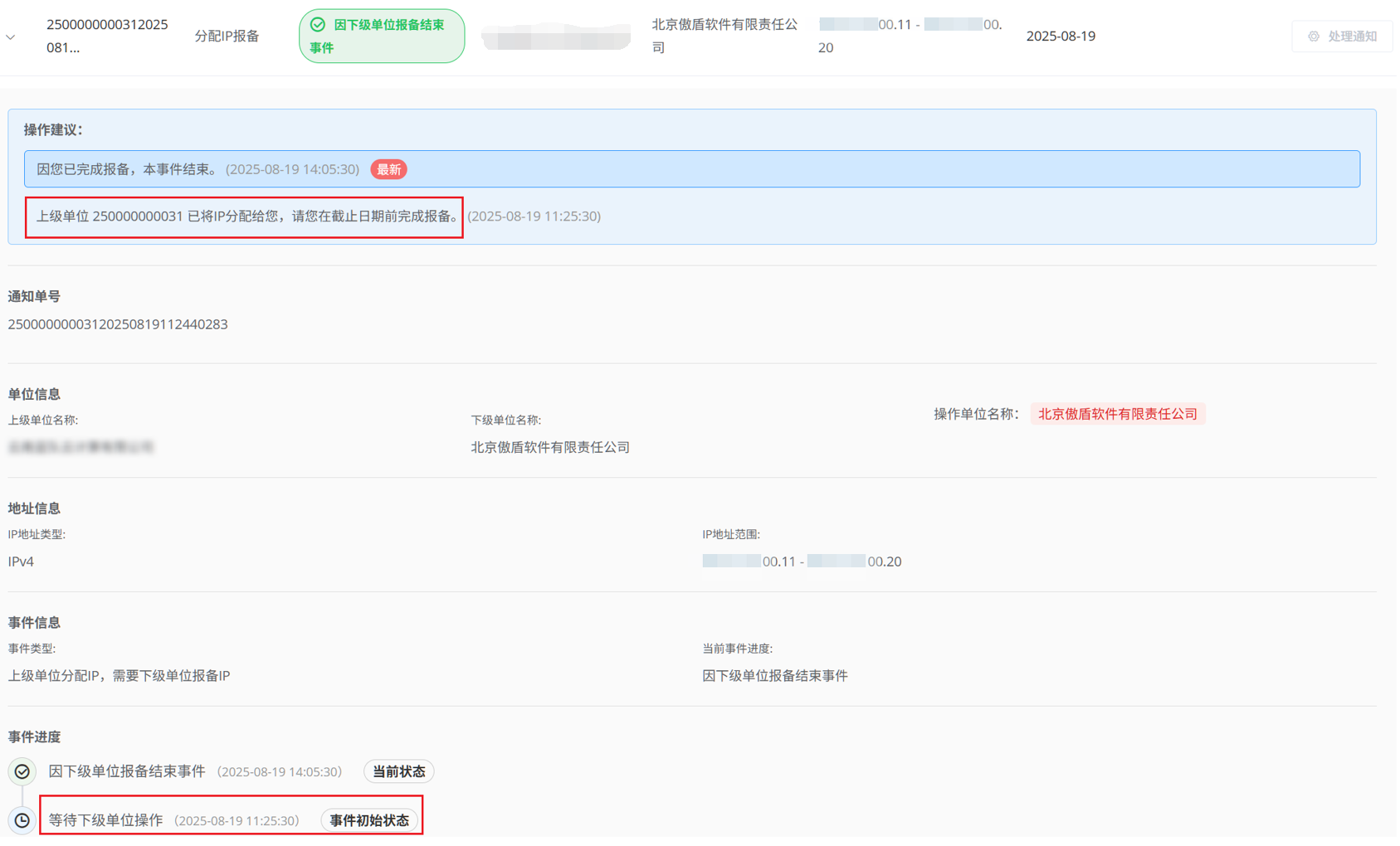 企业侧备案系统接到IP报备通知,通知提示当前进度为:等待下级单位操作,此时接入商需按通知详情,进行相关IP分配报备操作。