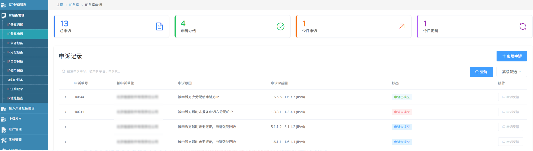在IP报备业务中,当上级报备单位或下级报备单位对对方操作存在异议时,或通过上级接口返回的IP报备结果得知相关IP已被其他单位报备存在报备冲突时, 或有已存在的IP报备超期情况时,都可以通过IP备案申诉功能提交申诉申请,也可以对已接收到的申诉通知进行反馈。IP报备申诉向上下级报备单位提供了有效的线上线下沟通渠道, 通过IP报备申诉可以有效及时的解决异常IP地址报备问题。