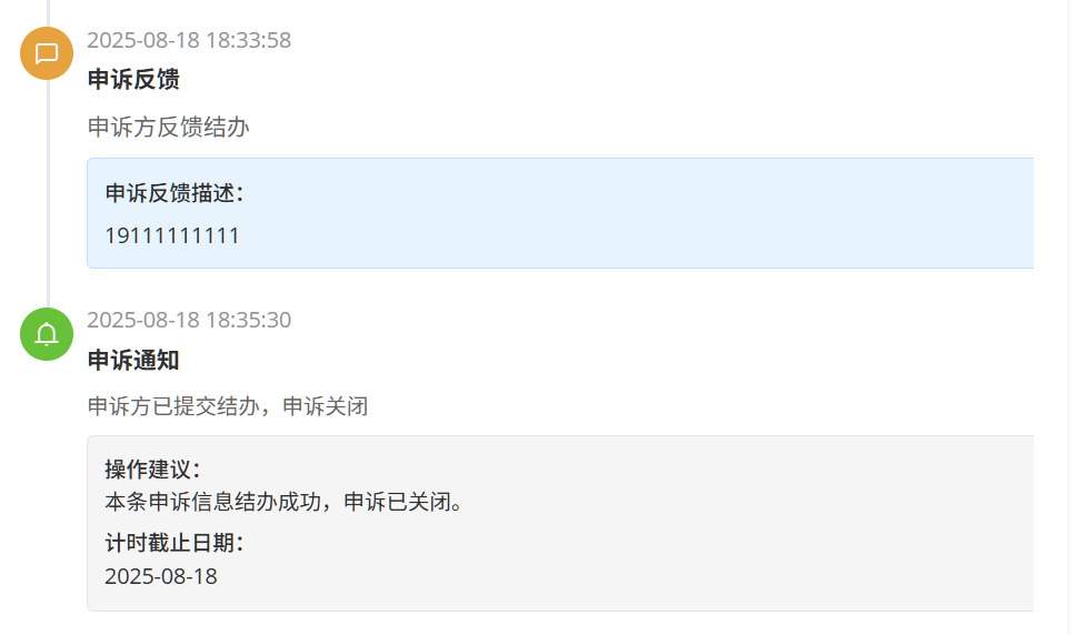 最终根据沟通,申诉方(我方)发起申诉结办,本次申诉申请处理完毕(双方已达成一致)