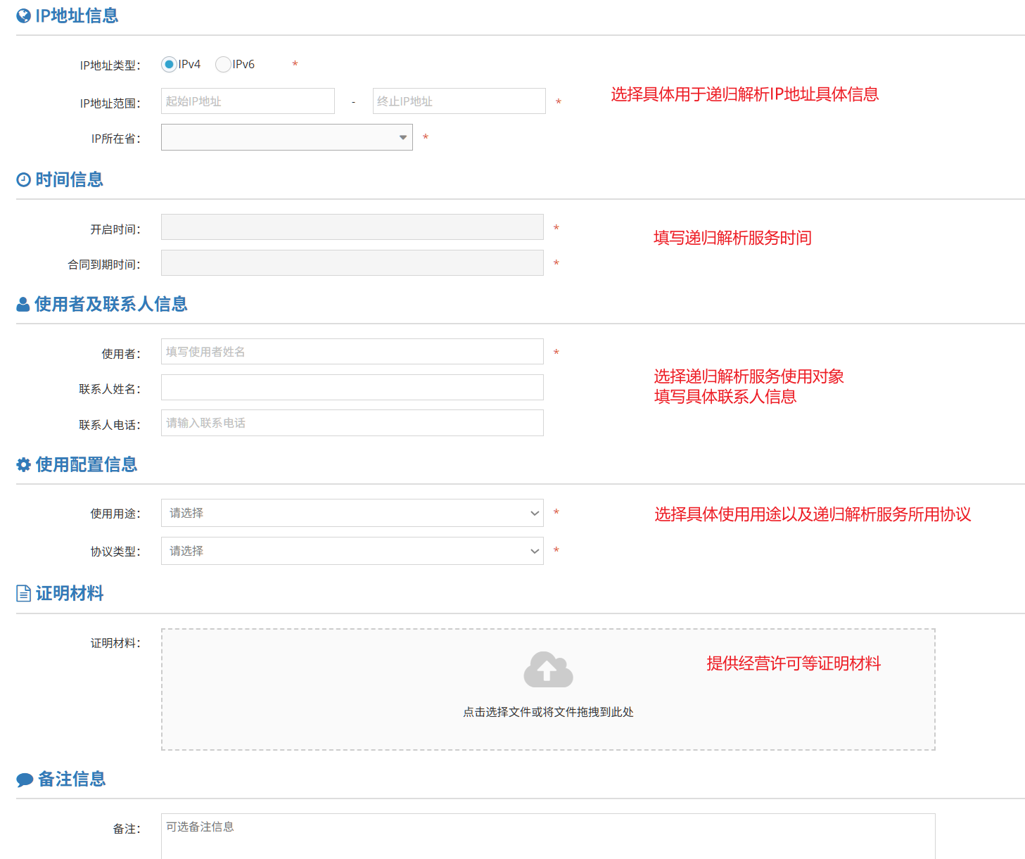 | 证明材料 | 递归解析服务许可、仅开展权威解析服务用户声明等pdf文件 |